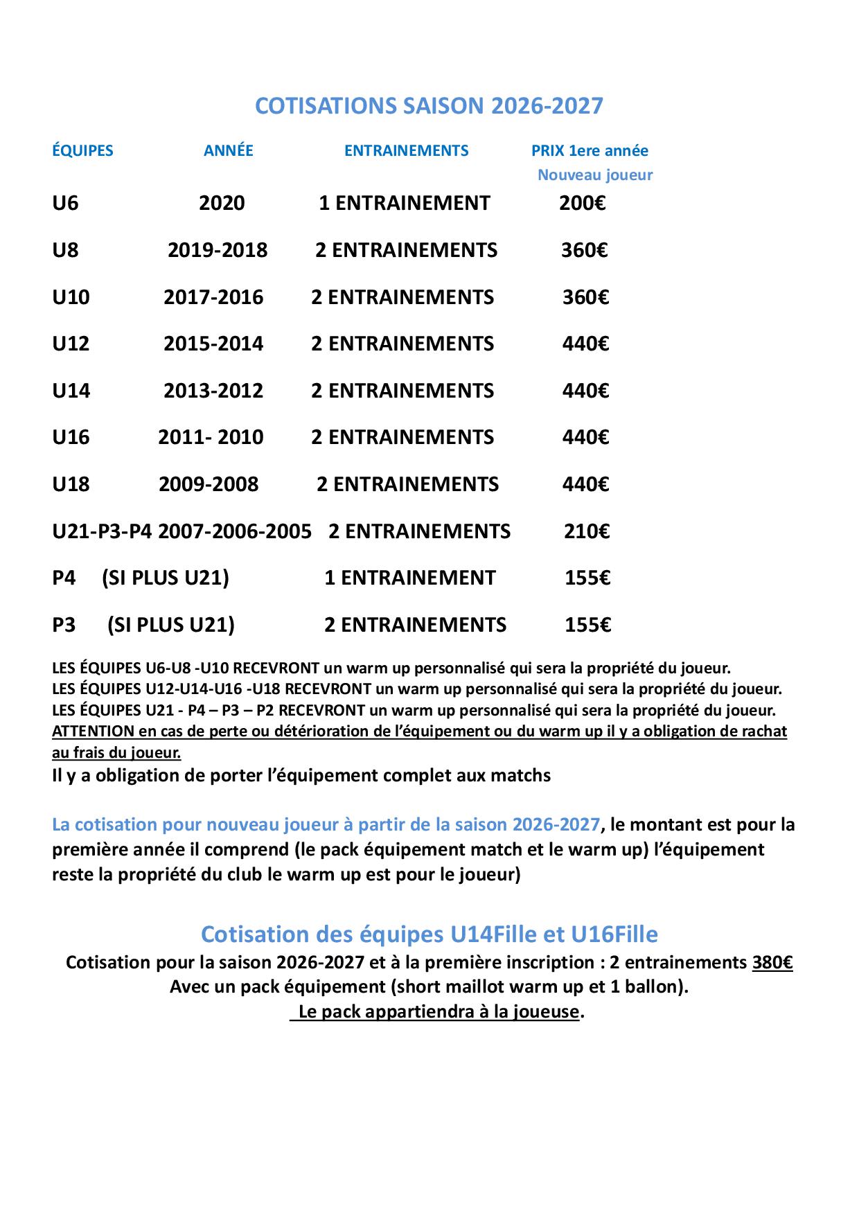Afin de permettre à tout le monde d'être en règle pour le début de la saison, nous proposons un étalement du montant de la cotisation. Vous trouverez ci-dessous le planning des versements et, en bas de la page, le tableau des montants des cotisations par équipe (pour calculer le solde à payer) :